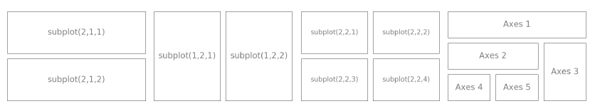 생성된 창에서 그래프 배치를 어떻게 할것인가에 대한 설정인데 아래 그림을 보시면 이해가 쉬울 것 같습니다. subplot을 어떻게 설정하느냐에 따라 아래와 같이 그래프 배치가 가능합니다.